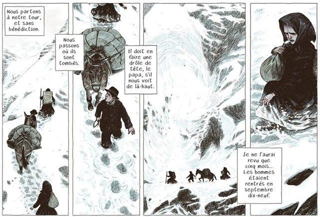 Cet album dépeint en quelques pages les mœurs du début du XXème siècle et le courage des femmes de cette époque qui pour la plupart ont traversé difficilement ces années de guerre. Ce récit dramatique par le côté historique traité (fin de guerre) et pourtant plein d'espoir (émancipation des femmes) illustrés de paysages enneigés dont le froid gagne le lecteur, offre l'histoire un périple à travers les montagnes de deux femmes cherchant à fuir leur vie et un avenir sombre. L'auteur aurait pu s'arrêter à un tel sujet mais il y a insérer une touche de frisson avec le personnage de Félix Arpin détestable par certains côtés dont on peut facilement comprendre les motivations notamment lorsqu'il fait référence à une pension s'il avait pu être défiguré comme ces gueules cassées.